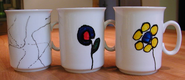 Några muggar jag målat. Det svarta är gjord med relieffärg på tub.