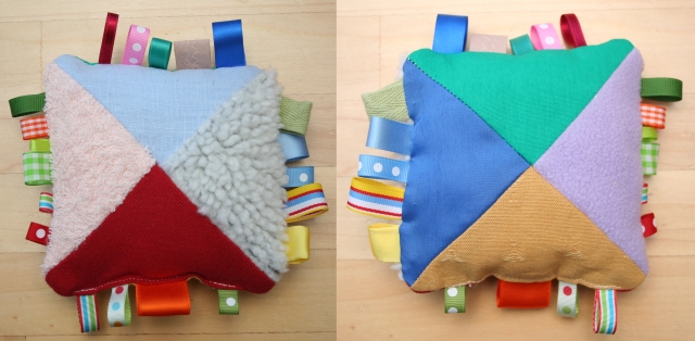 Sydde en pillkudde till systerdottern. Använt olika tyger som känns olika att ta på, så det är inte bara banden man kan pilla på. Makens systerdotter fick kudden till höger. Klicka på bilderna för att se båda sidorna av kuddarna. (2008) |
