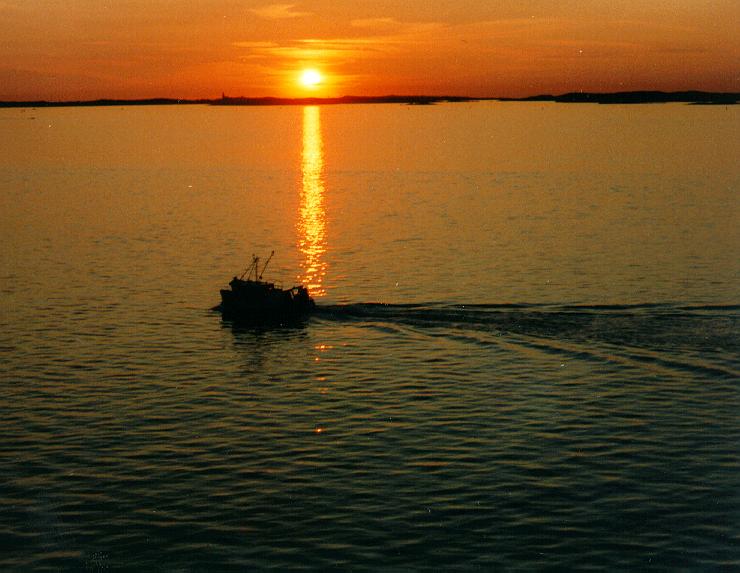 | En fiskebåt i solnedgång. |